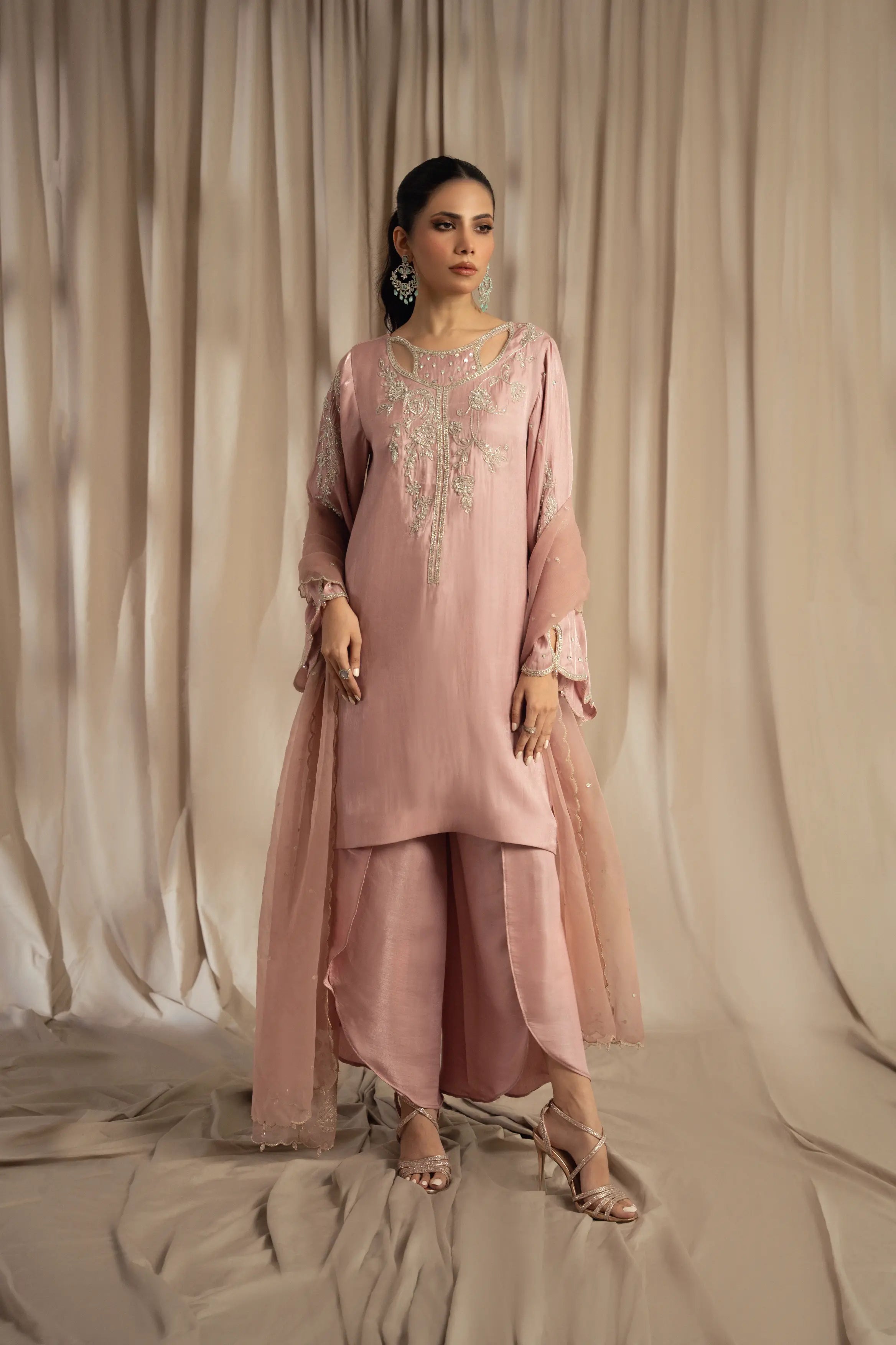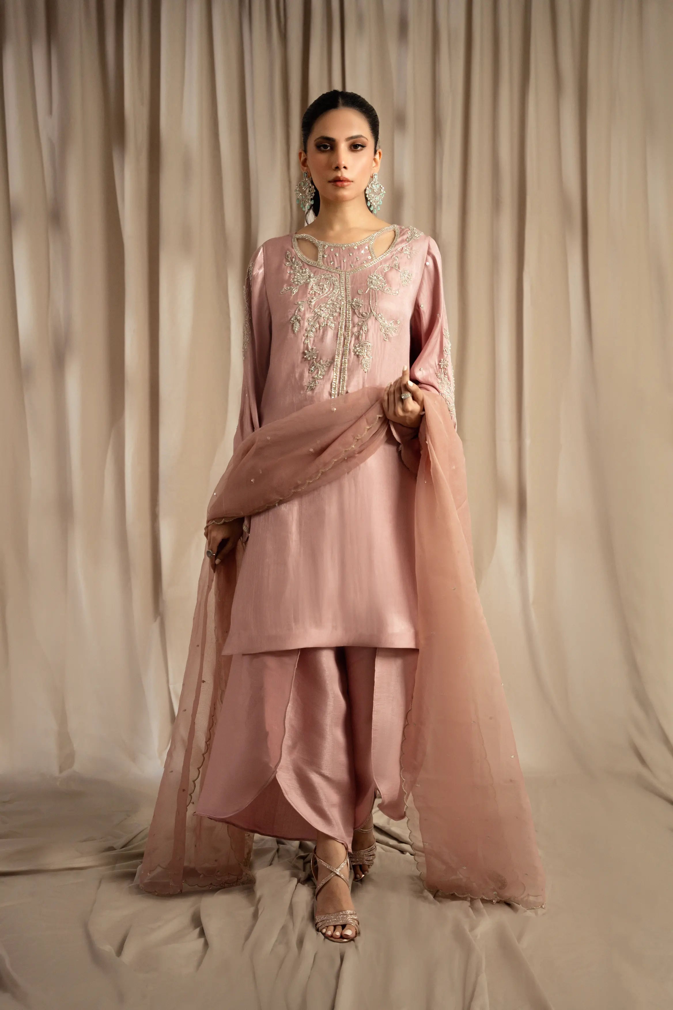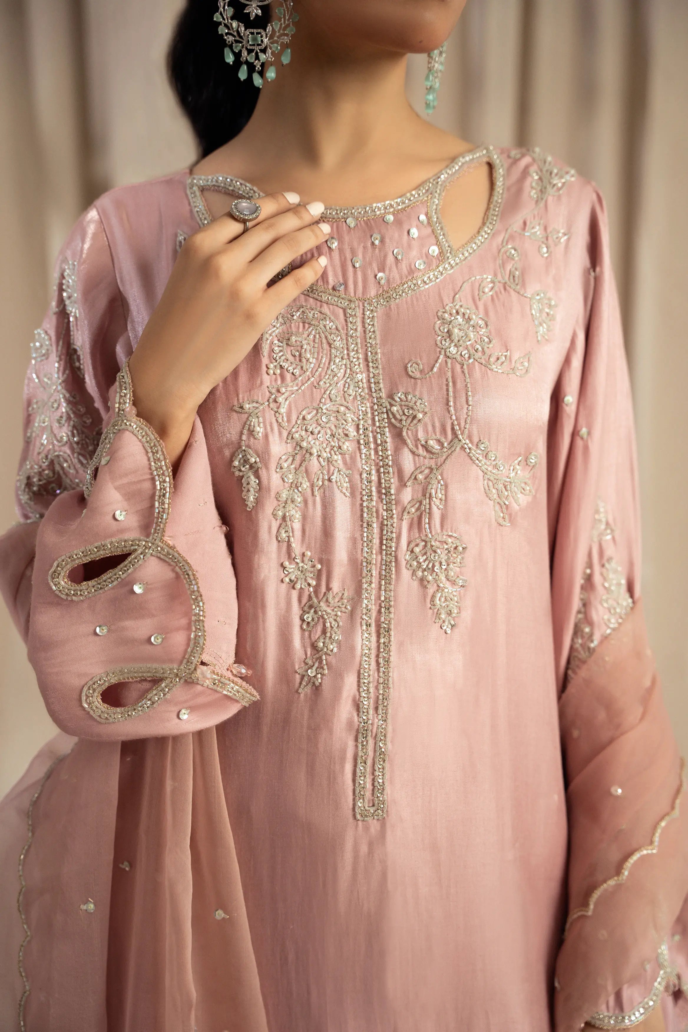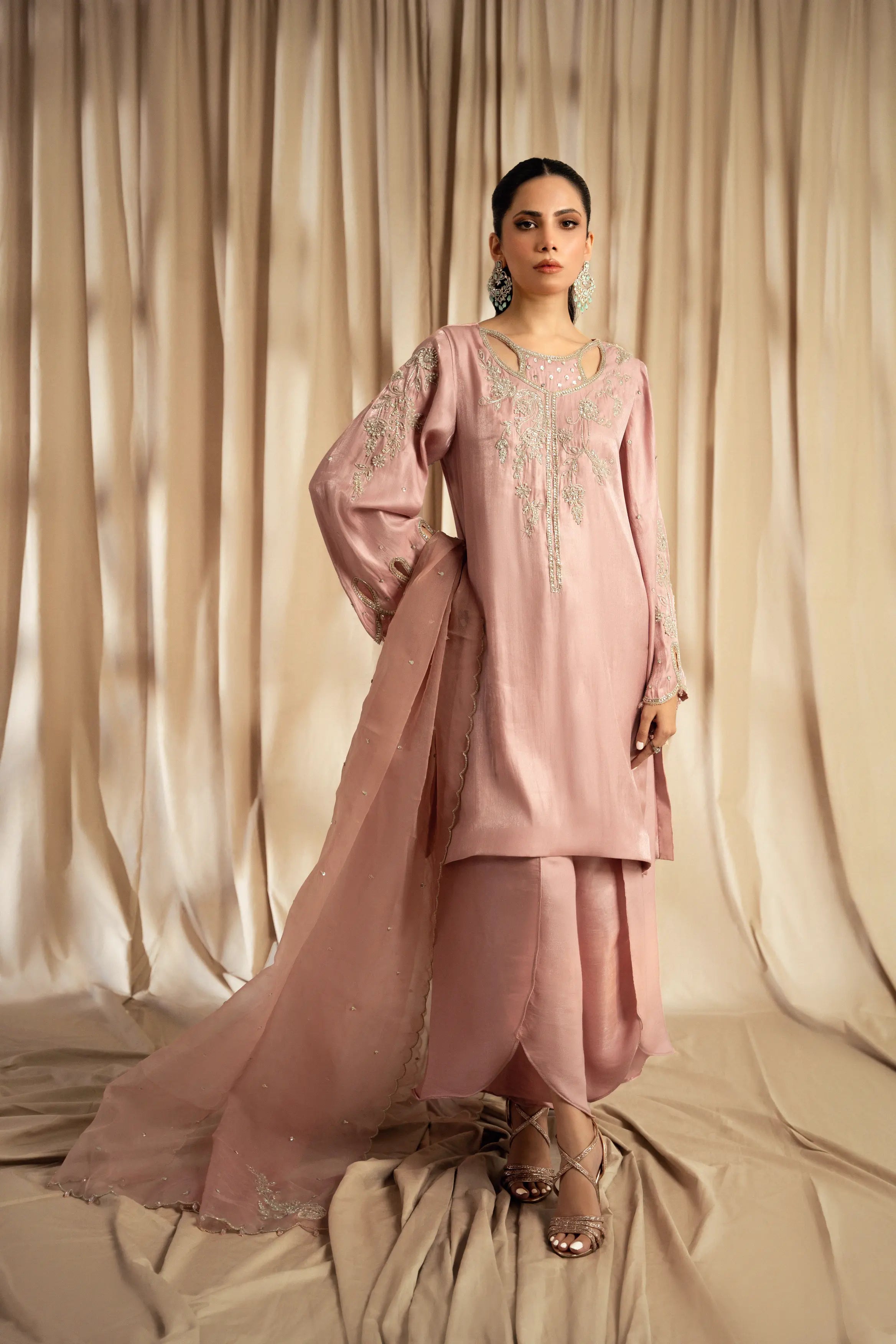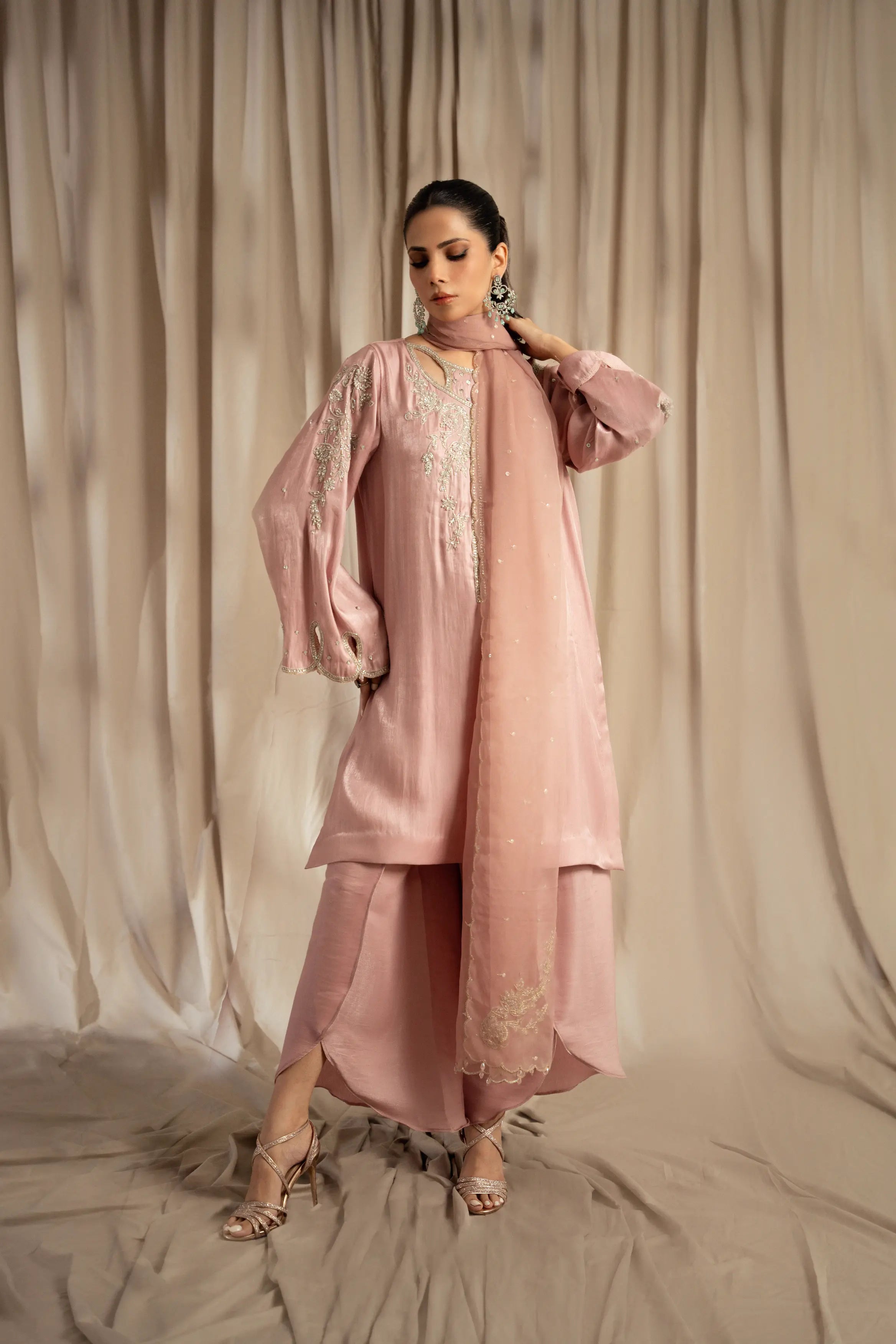 LIA - Festive Formal: The ensemble features a tea pink sheesha silk short shirt embellished with intricate contrasting light grey hand embroidery of bead, sequins, pearl and cutwork.